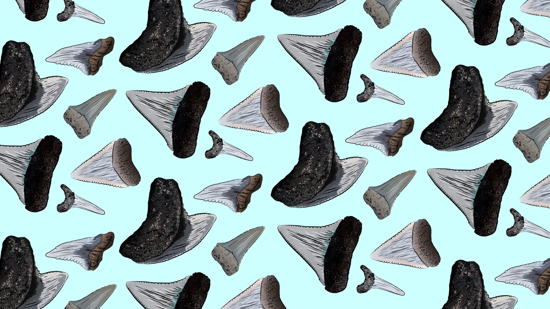 All of the shark teeth in this print are drawn based on teeth that we have collected on our adventures over the years.